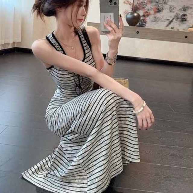 ワンピース レディース タイトワンピース ロング丈 ノースリーブ ストライプ 春 夏 スリム スリット かわいい 大人可愛い きれいめ シンプル カジュアル 大人 おしゃれ レトロ ラブリー キュート Vネック ロング 袖なし 黒 ブラック くすみカラー S M L 20代 30代 学生 通学 デート お出かけ 女子会 リゾート 旅行 海 着回し 普段使い 韓国 韓国系 オルチャン ファッション コーデ スタイル モテ 穴あき 定番 プチプラ 送料無料 流行 インスタ映え