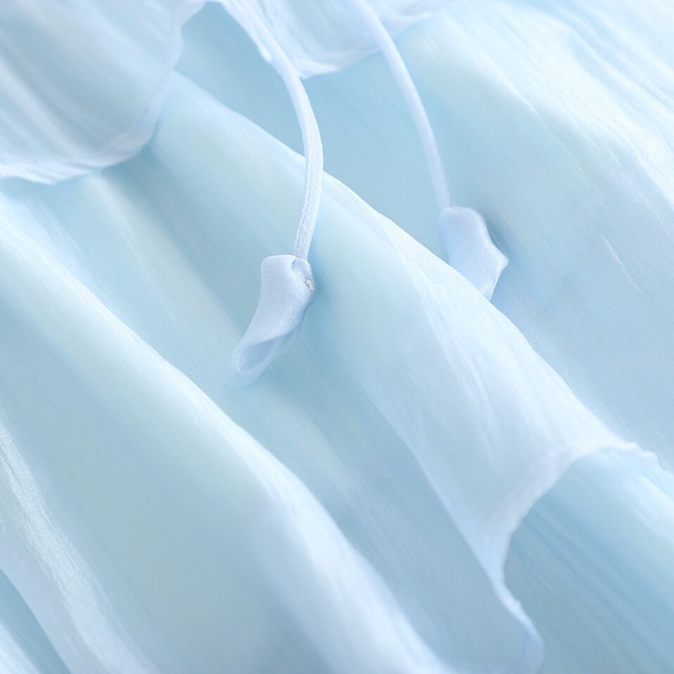Aラインシルエットで体型カバーも叶え、デイリーユースから特別な日のお出かけまで幅広く活躍します。胸元のさりげない装飾が、上品なアクセントになっています。