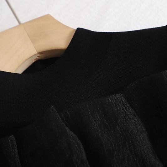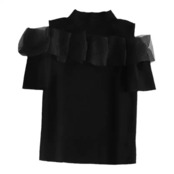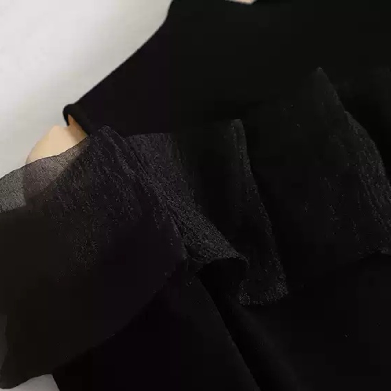 首元のハイネックと、肩から流れるようなオーガンジーのフリルが、女性らしい上品さを演出するトップス。