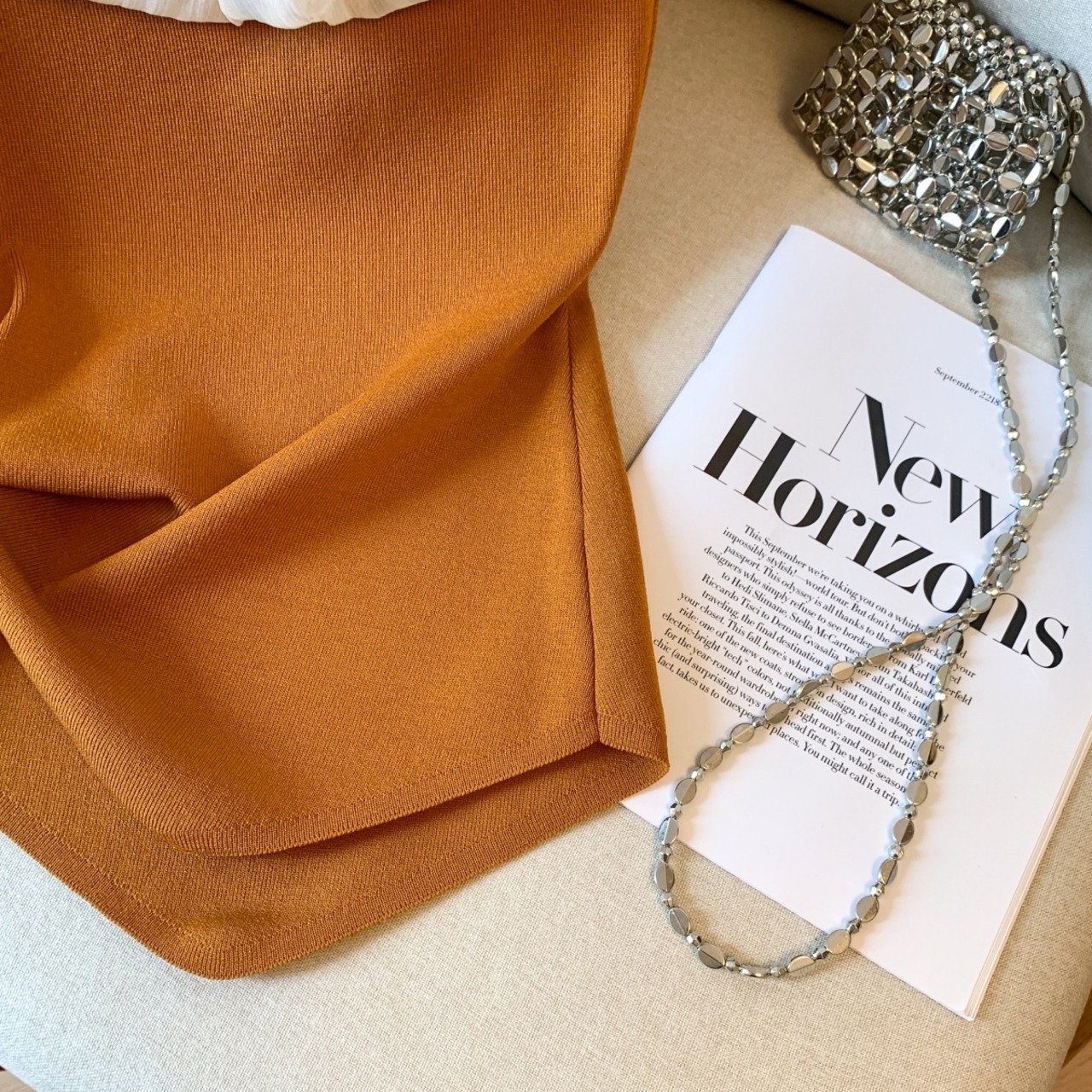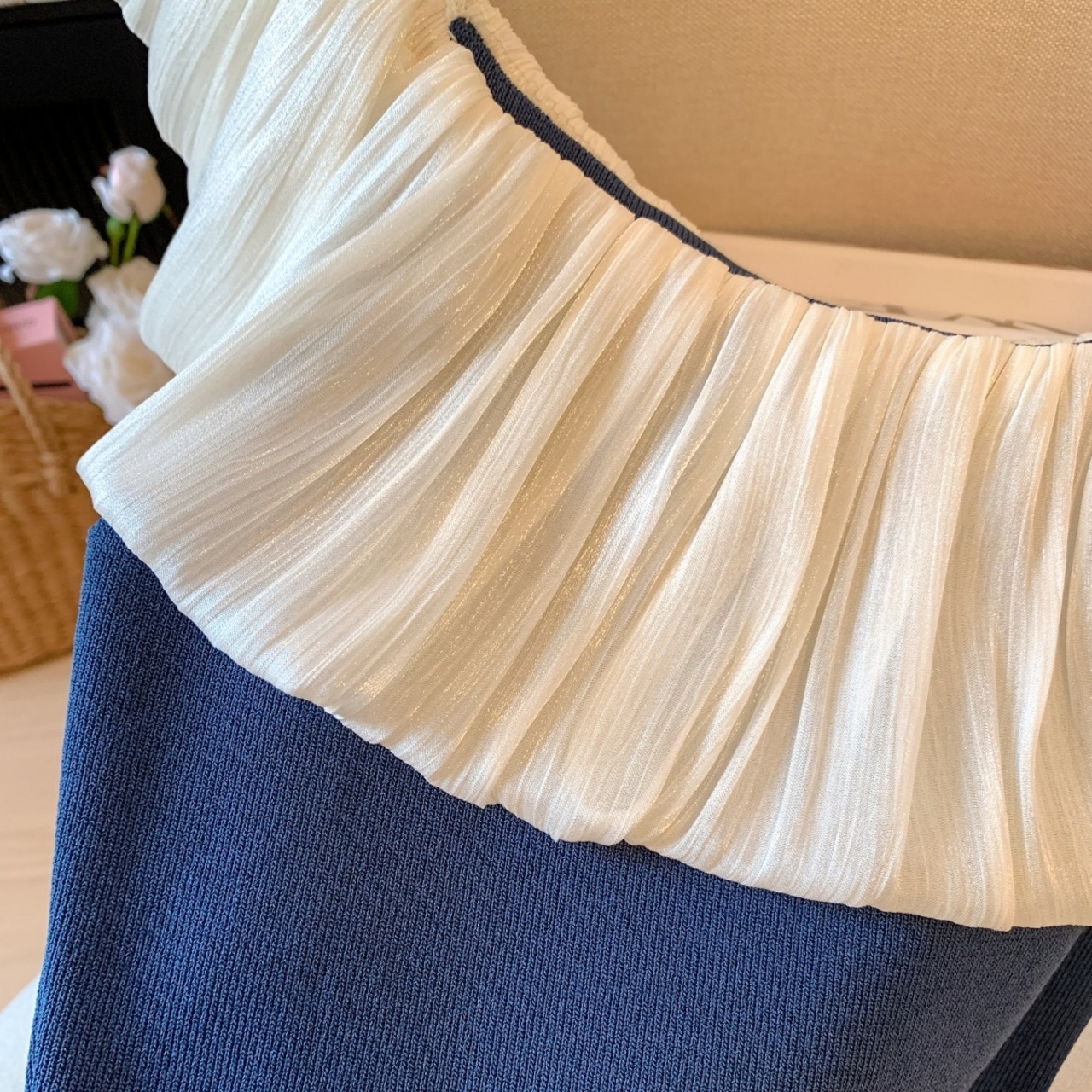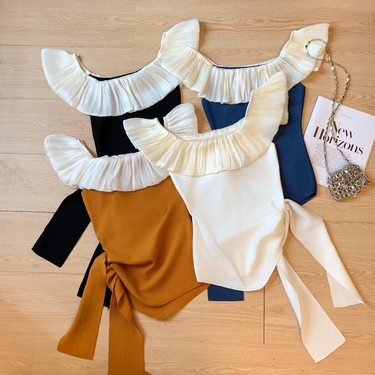 ボートネックとフレアスリーブが女性らしい印象を与えるニットトップスです。繊細なプリーツのついたオフホワイトカラーの襟元が、上品さをプラス。
