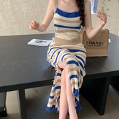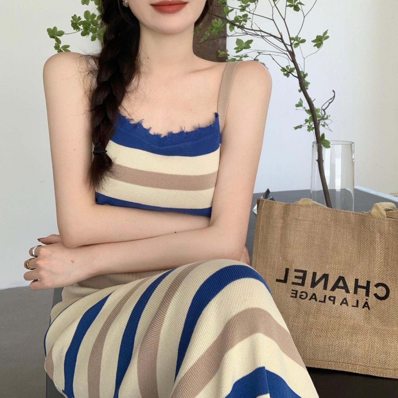 上品なストライプ柄と、こなれた雰囲気のフリンジが特徴的なロングキャミソールワンピース。