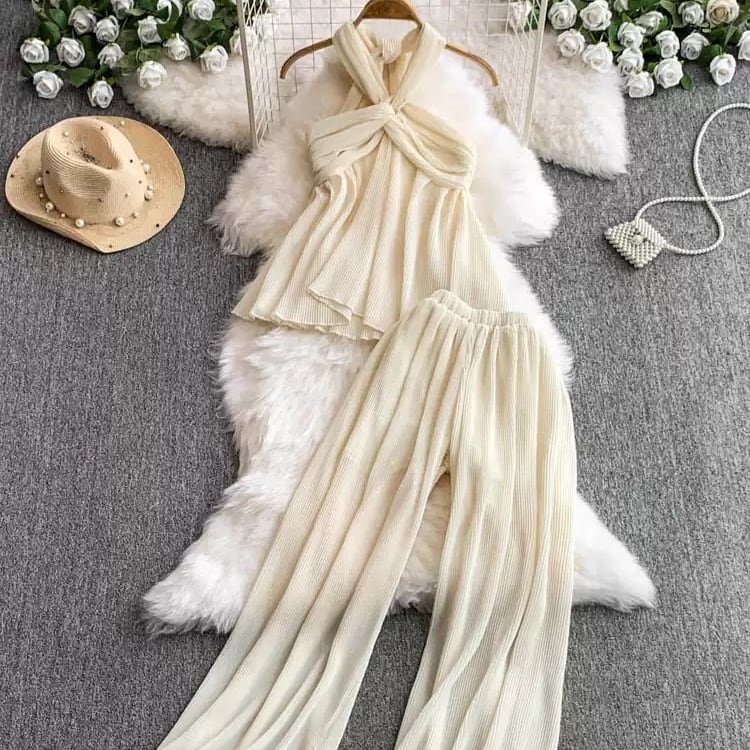 セットアップ レディース カットソー ワイドパンツ ロング丈 ノースリーブ 無地 春 夏 セミフレア 透け感 かわいい 大人可愛い きれいめ シンプル カジュアル 大人 おしゃれ 大人可愛い 大人女子 ラブリー キュート クール セクシー ホルターネック ロング 袖なし 上下セット くすみカラー 大人カラー S M L 20代 30代 デート お出かけ 女子会 休日 アウトドア リゾート 着回し 韓国 韓国系 オルチャン ファッション コーデ スタイル モテ 送料無料 トレンド 流行 インスタ映え | Rena 韓国ファッション レディースアパレル