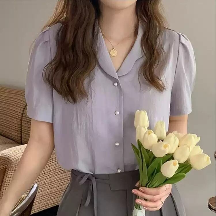 一枚で様になる、ボタンダウン七分袖シャツ。パフスリーブが、シンプルなデザインに可愛らしさを添えます。
