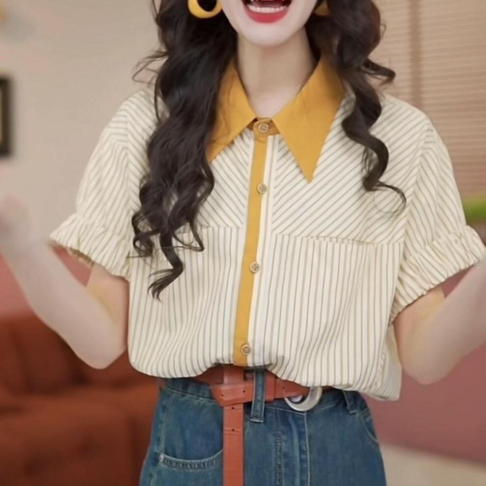 トップス レディース シャツ ショート丈 半袖 柄 春 夏 セミフレア かわいい 大人可愛い きれいめ シンプル カジュアル 大人 上品 おしゃれ 大人可愛い 個性的 Vネック 襟付き 袖なし 黄色 イエロー くすみカラー 大人カラー ベイクドカラー S M L XL 20代 30代 ビジネス 通勤 学生 通学 デート お出かけ 公園デビュー 女子会 休日 旅行 着回し 普段使い 韓国 韓国系 オルチャン ファッション コーデ スタイル 楽ちん モテ 定番 送料無料 トレンド 流行 インスタ映え | Rena 韓国ファッション レディースアパレル