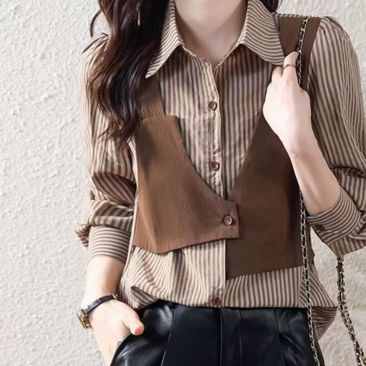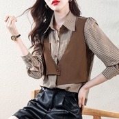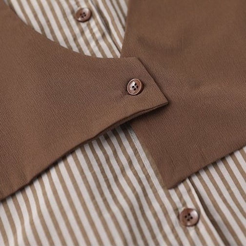 1枚で旬のレイヤードスタイルが完成。ストライプ柄のブラウスに、デザイン性の高いベストがドッキングされた、知的な大人のためのセットアイテムです。細見え効果のあるVラインと、異素材の組み合わせが、シンプルながらも洗練された印象を与えます。