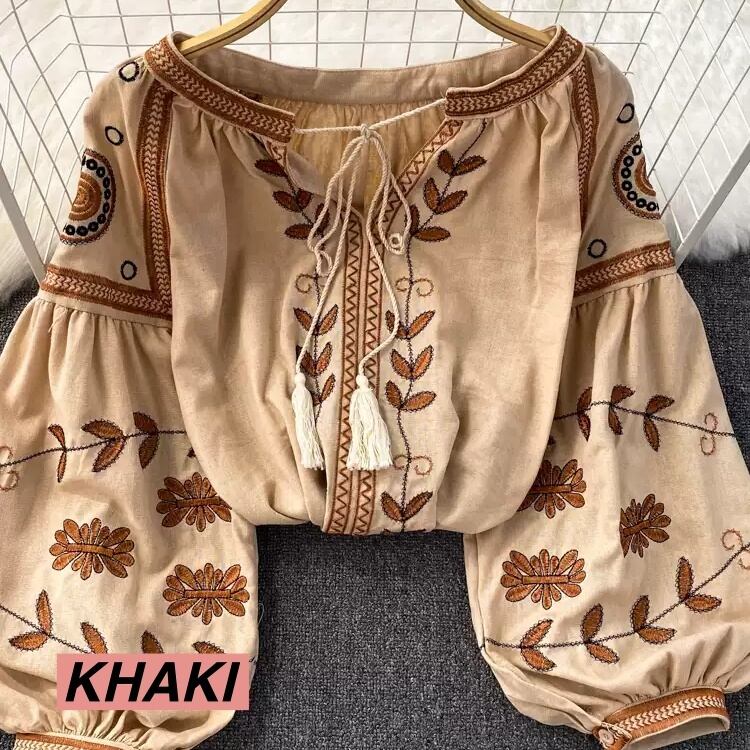 異国情緒あふれる刺繍が目を惹く、ボヘミアンブラウス。柔らかな風合いの生地に施された、温かみのあるリーフ柄と幾何学模様の刺繍が、着る人に優雅な物語を与えます。ふんわりとしたボリュームスリーブと、タッセル付きのVネックが、顔周りを華やかに演出し、一枚で主役級の存在感を放ちます。
