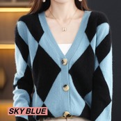 端正なアーガイル柄が知的な印象を与える、ニットカーディガン。ふんわりとした柔らかい素材と、上品なゴールドボタンが、クラシックな柄にモダンな華やかさを添えます。一枚で主役になる存在感で、いつものスタイルを格上げする、大人のための洗練されたアイテムです。
