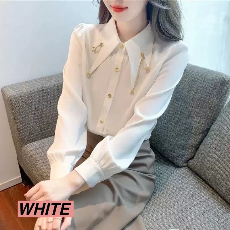気品あふれるカラーに、ゴールドのチェーンが煌めくブラウス。襟元から肩にかけてあしらわれた繊細なチェーンとボタンが、まるでアクセサリーのように華やかで、着こなしをクラスアップさせます。一枚で主役になる、エレガントで個性的なデザインは、大人の女性の魅力を最大限に引き立てます。