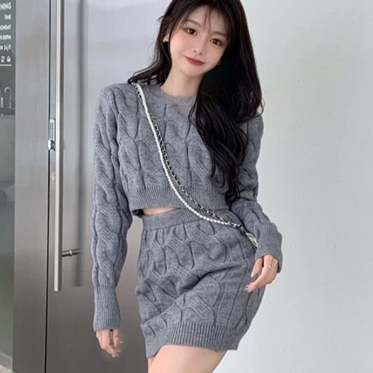 甘すぎないケーブル編みが魅力の、ニットセットアップ。上品な温かみのあるカラーと、さりげない凹凸感のある編み地が、洗練された大人の女性らしさを引き立てます。クロップド丈のトップスと、ミニ丈のスカートが、バランスの取れたスタイルを演出し、スタイルアップも叶えます。セットで着るだけで、旬のワントーンコーデが完成する、魅力的なアイテムです。