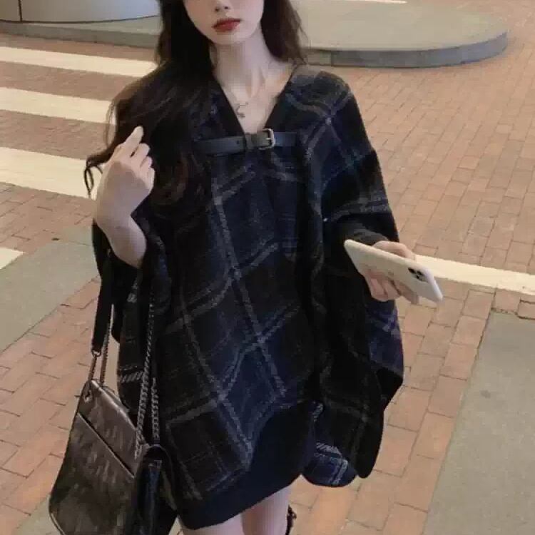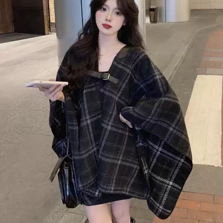 街を歩くだけで視線を集める、シックなチェック柄ポンチョ。