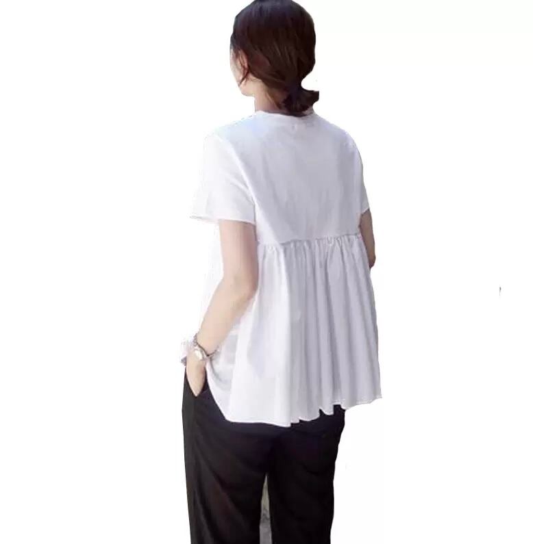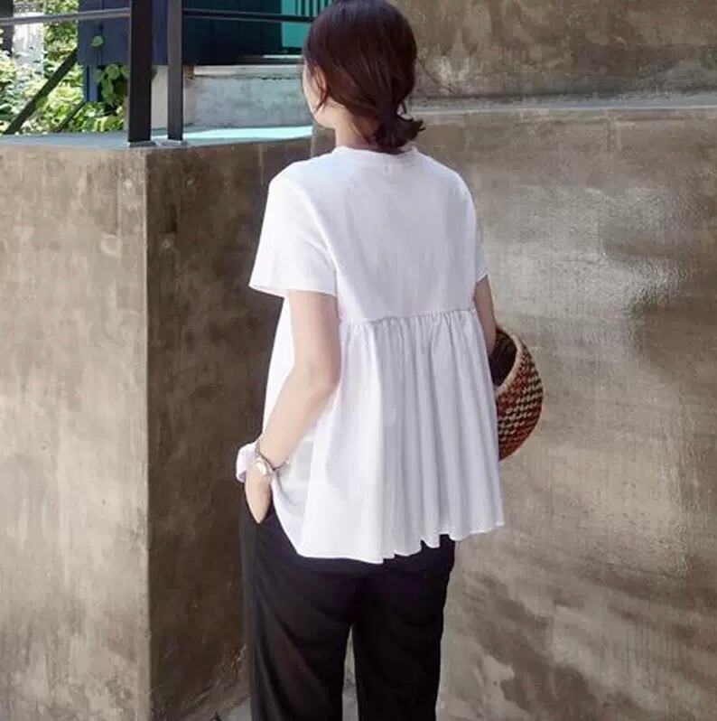 トップス Tシャツ カットソー 白シャツ 白トップス 袖あり 半袖 襟なし プリーツ かわいい シンプル おしゃれ キュート ガーリー S M L XL 白 ホワイト 無地 夏 10代 20代 30代 40代 レディース 学生 デート お出かけ 休日 韓国系 送料無料 | Rena 韓国ファッション レディースアパレル