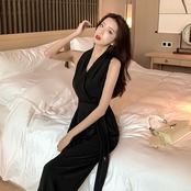 レディース ワンピース オールインワン ワンピドレス Vネック スリム ウエストリボン 大人 おしゃれ 大人女子 セクシー S M L XL ホワイト ブラック 夏 休日 パーティー イベント 美脚 脚長 送料無料 | Rena 韓国ファッション レディースアパレル