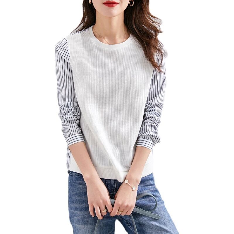 レディース トップス 袖あり ラウンドネック 大人可愛い きれいめ シンプル 大人 上品 おしゃれ かっこいい 大人女子 ラフ S M L XL 2XL ストライプ 女性用 オフィス 通勤 学生 デート お出かけ 女子会 休日 ファッション 送料無料 | Rena 韓国ファッション レディースアパレル
