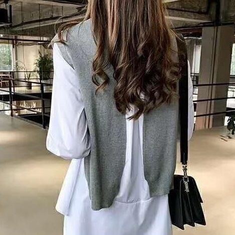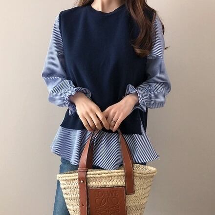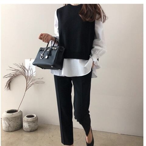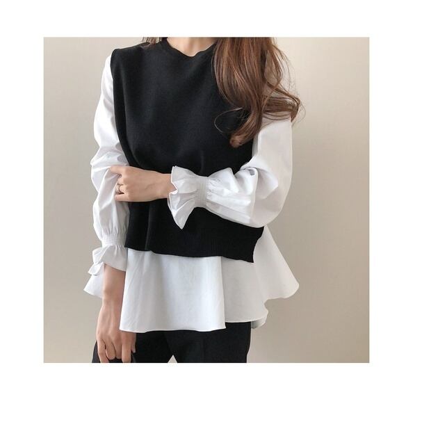 ニットベスト×長袖シャツのアンサンブルトップスです。