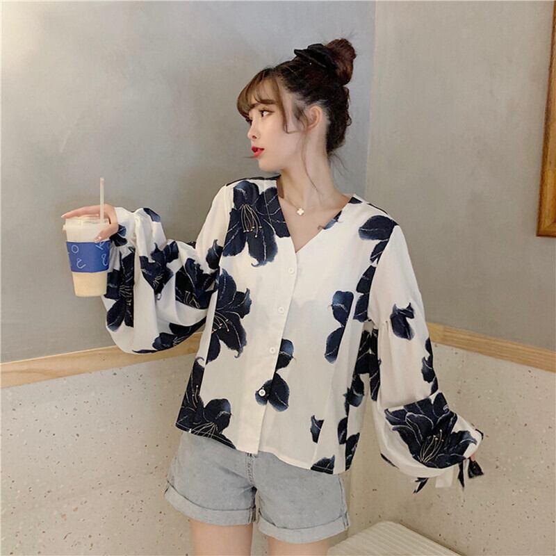 レディース トップス シャツ ブラウス 白シャツ 長袖 ボリューム袖 Vネック スタンドカラー シフォン かわいい カジュアル おしゃれ エスニック ラフ メンズライク ラブリー ルーズ 存在感 S M L XL ホワイト 柄 花柄 春 夏 10代 20代 30代 学生 通学 デート お出かけ 女子会 休日 リゾート 旅行 普段使い 韓国系 ファッション 楽ちん モテ 体系カバー 送料無料 | Rena 韓国ファッション レディースアパレル