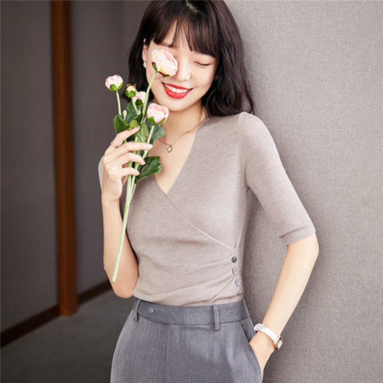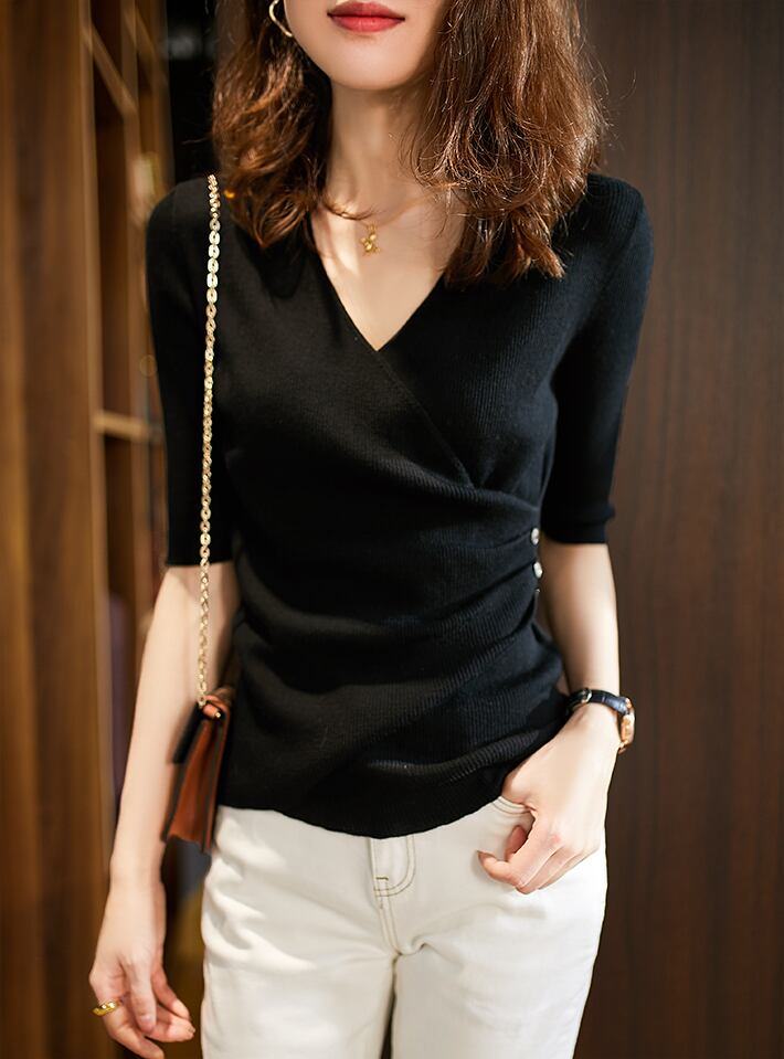 大きく開いたVネックでデコルテをきれいに見せることができます♪