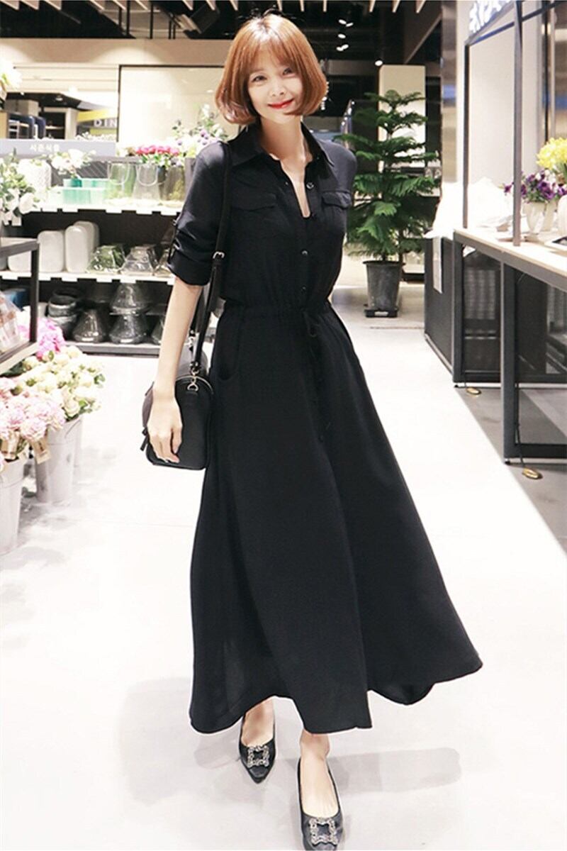 レディース ワンピース シャツワンピース フレアワンピース ロング丈 長袖 フレア Aライン 大人可愛い 大人 おしゃれ かっこいい エレガント S M L ブラック デート お出かけ 女子会 休日 普段使い 送料無料 | Rena 韓国ファッション レディースアパレル