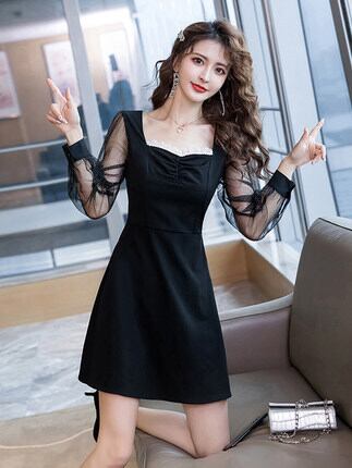レディース ワンピース ミニスカート ワンピドレス ミニ ミニ丈 ショート ショート丈 袖あり 長袖 スクエアネック 襟なし タイト 細身 フリル 透け感 シースルー 薄手 大人可愛い きれいめ シンプル 大人 上品 おしゃれ お洒落 大人可愛い 大人女子 クール セクシー 抜け感 S M L XL 黒 ブラック 無地 春 夏 秋 二次会 10代 20代 30代 デート お出かけ 女子会 お泊まり パーティー ファッション モテ 美脚 送料無料 | Rena 韓国ファッション レディースアパレル