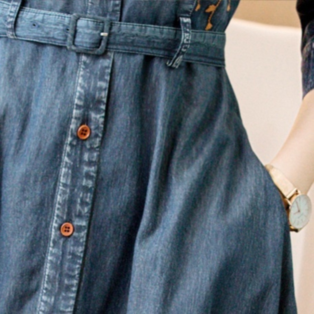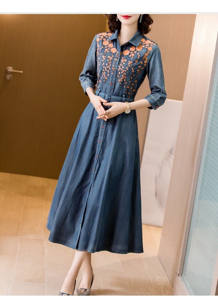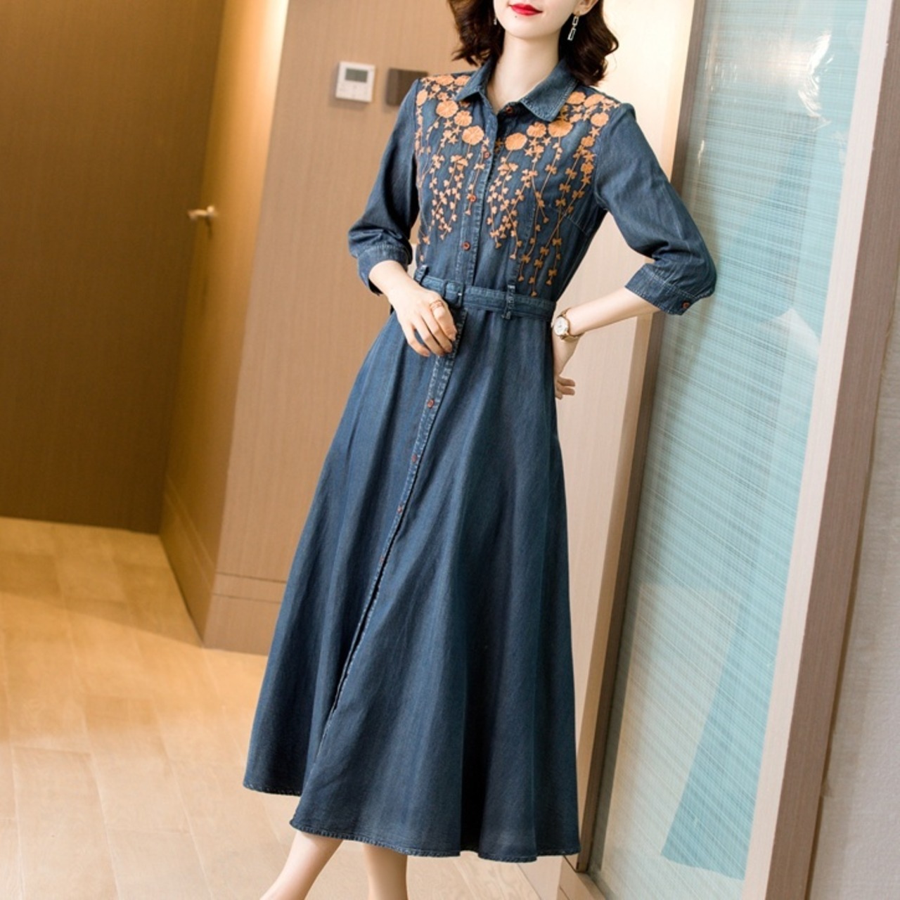 レディース トップス スカート ワンピース ロングスカート デニムスカート デニムワンピース ロング ロング丈 マキシ丈 袖あり 7分袖 七分袖 長袖 襟付き 細身 ワイド 切り替えデザイン 刺繍 ベルト ウエストマーク ウエストリボン 切り替えデザイン 2way 3way デニム 厚手 きれいめ 大人 上品 おしゃれ お洒落 大人女子 S M L XL 2XL 3XL 青 ブルー 無地 柄 春 夏 秋 20代 30代 40代 50代 デート お出かけ 送料無料 | Rena 韓国ファッション レディースアパレル