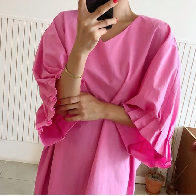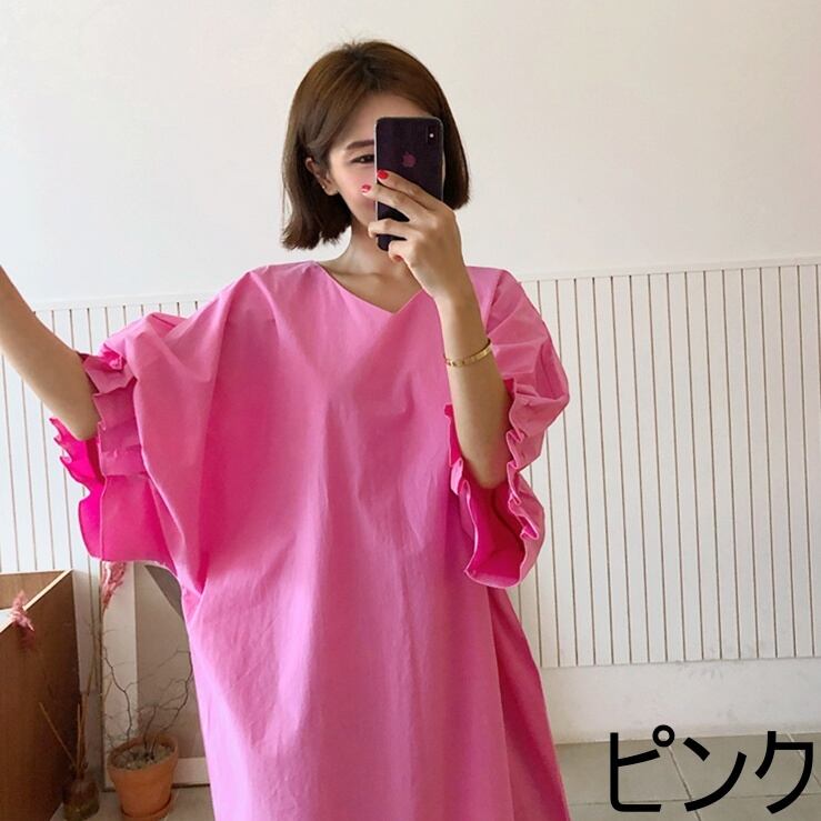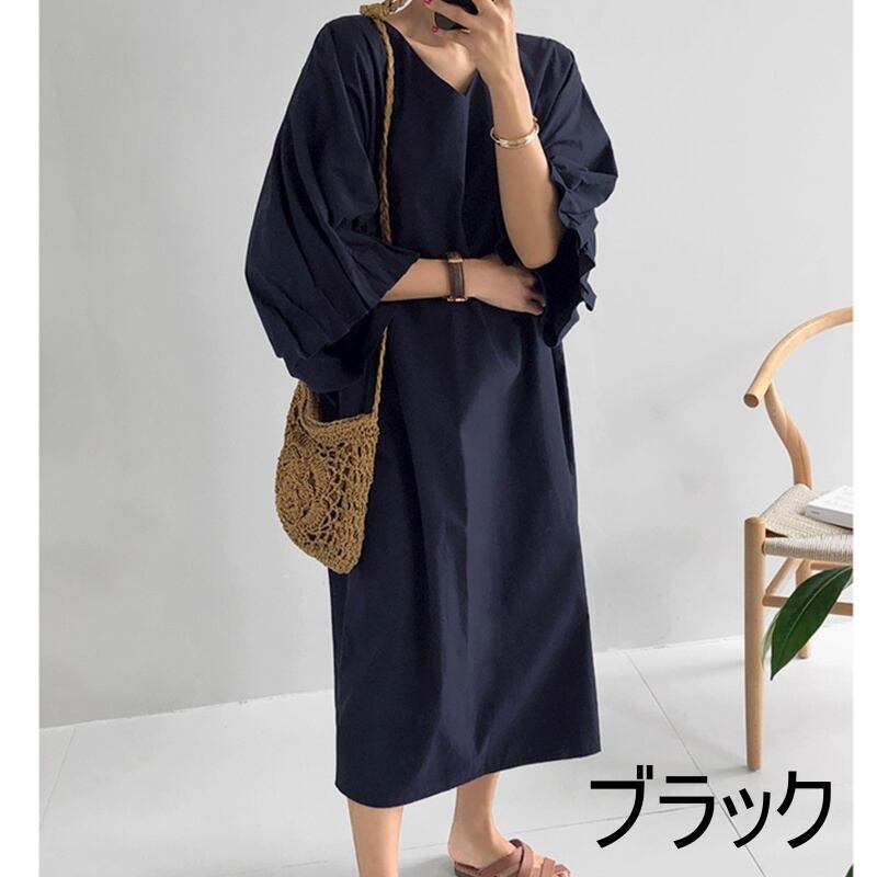 レディース ワンピース シャツ ブラウス カットソー ロングスカート シャツワンピース 膝下 ロング ロング丈 袖あり 半袖 5分袖 五分袖 ボリューム袖 Vネック 襟なし ワイド フリル 大人可愛い シンプル カジュアル 大人 おしゃれ お洒落 大人可愛い 大人女子 ラフ S M L XL 大きい 大きめ ゆったり ゆる 黒 ブラック ピンク 無地 春 夏 秋 10代 20代 30代 お出かけ 女子会 お泊まり 休日 旅行 着回し 普段使い コーデ 楽ちん 送料無料 ゆったり | Rena 韓国ファッション レディースアパレル