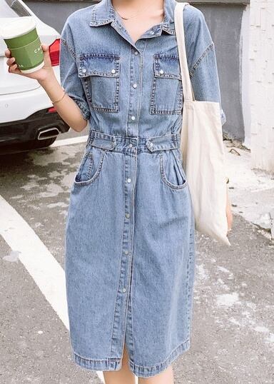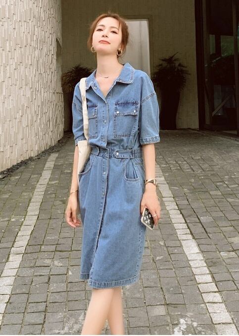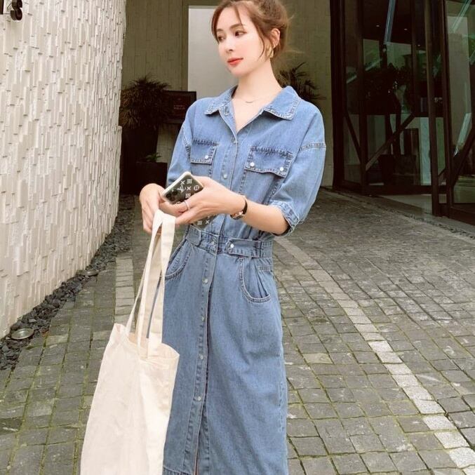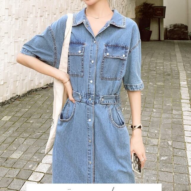 レディース ワンピース シャツ ジャケット 上着 デニムスカート デニムワンピース ひざ丈 ロング ロング丈 袖あり 半袖 5分袖 五分袖 襟付き 細身 ストレート ウエストマーク 前開き 2way デニム かわいい 大人可愛い シンプル カジュアル 大人 おしゃれ お洒落 大人可愛い 大人女子 S M L 春 夏 秋 10代 20代 30代 通学 デート お出かけ 女子会 お泊まり 休日 着回し 普段使い コーデ 送料無料 ゆったり | Rena 韓国ファッション レディースアパレル
