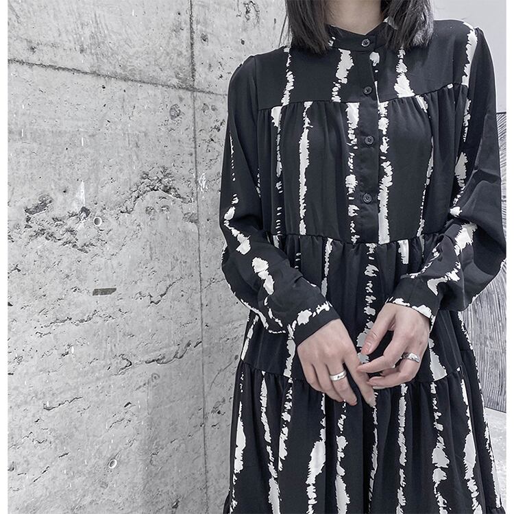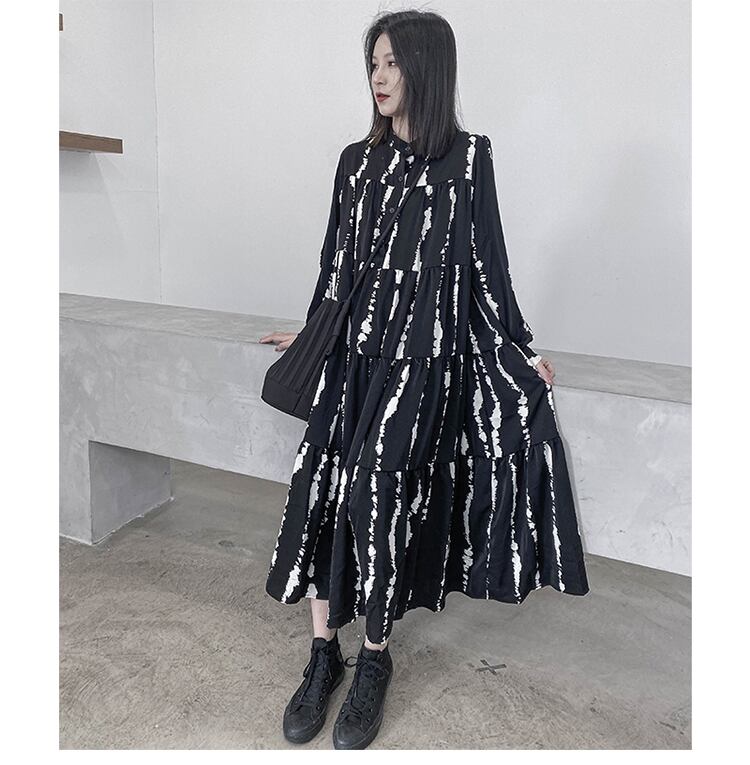 レディース ワンピース シャツ ブラウス カットソー ティアードワンピース ロング ロング丈 マキシ マキシ丈 袖あり 長袖 ラウンドネック クルーネック 襟なし Aライン おしゃれ お洒落 かっこいい ラフ 個性的 クール モード系 フリーサイズ ゆったり ゆる 黒 ブラック 柄 春 夏 秋 10代 20代 30代 女性用 マタニティ お出かけ 女子会 お泊まり 休日 旅行 着回し 普段使い お揃い オルチャン ファッション コーデ スタイル 楽ちん 体系カバー 送料無料 ゆったり | Rena 韓国ファッション レディースアパレル