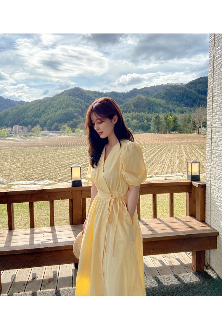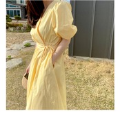 レディース ワンピース シャツ ブラウス カットソー 白シャツ シャツワンピース ロング ロング丈 マキシ マキシ丈 袖あり 半袖 ボリューム袖 Vネック 襟なし ウエストマーク ウエストリボン 切り替えデザイン 綿 ポリエステル 薄手 かわいい 大人可愛い きれいめ 大人 上品 おしゃれ お洒落 大人可愛い 大人女子 S M L XL 白 ホワイト イエロー 無地 春 夏 秋 10代 20代 30代 デート お出かけ 女子会 休日 リゾート ファッション コーデ スタイル モテ 送料無料 | Rena 韓国ファッション レディースアパレル