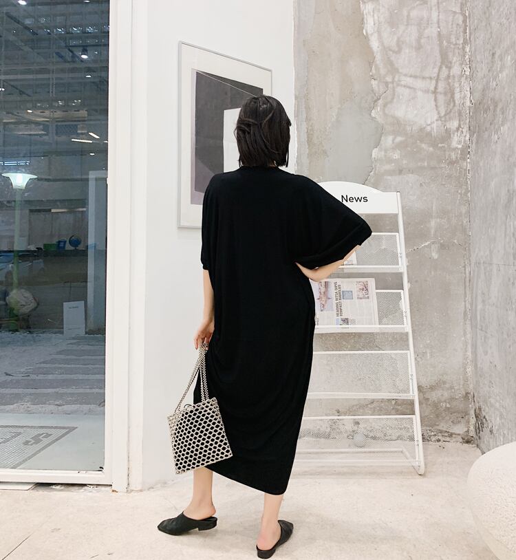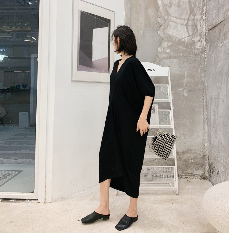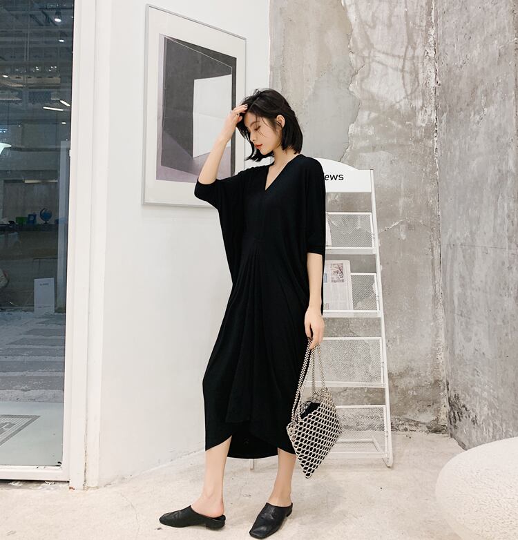 レディース ワンピース ミモレ ミモレ丈 ロング ロング丈 袖あり 半袖 Vネック 襟なし 大人可愛い きれいめ シンプル 大人 おしゃれ お洒落 かっこいい エスニック 大人可愛い 大人女子 ラフ 個性的 クール モード系 M L XL ゆったり 黒 ブラック 無地 春 夏 秋 10代 20代 30代 40代 50代 お出かけ 女子会 お泊まり 休日 旅行 普段使い 重ね着 ファッション コーデ スタイル 楽ちん 送料無料 ゆったり | Rena 韓国ファッション レディースアパレル