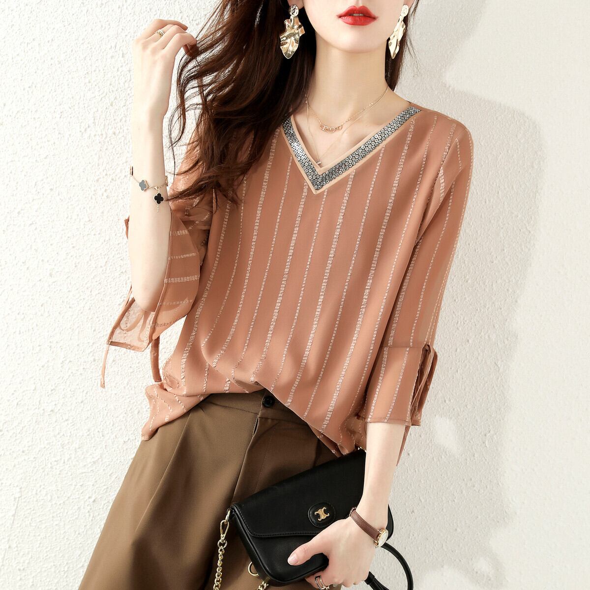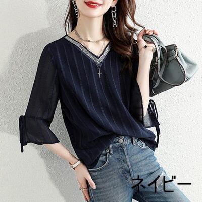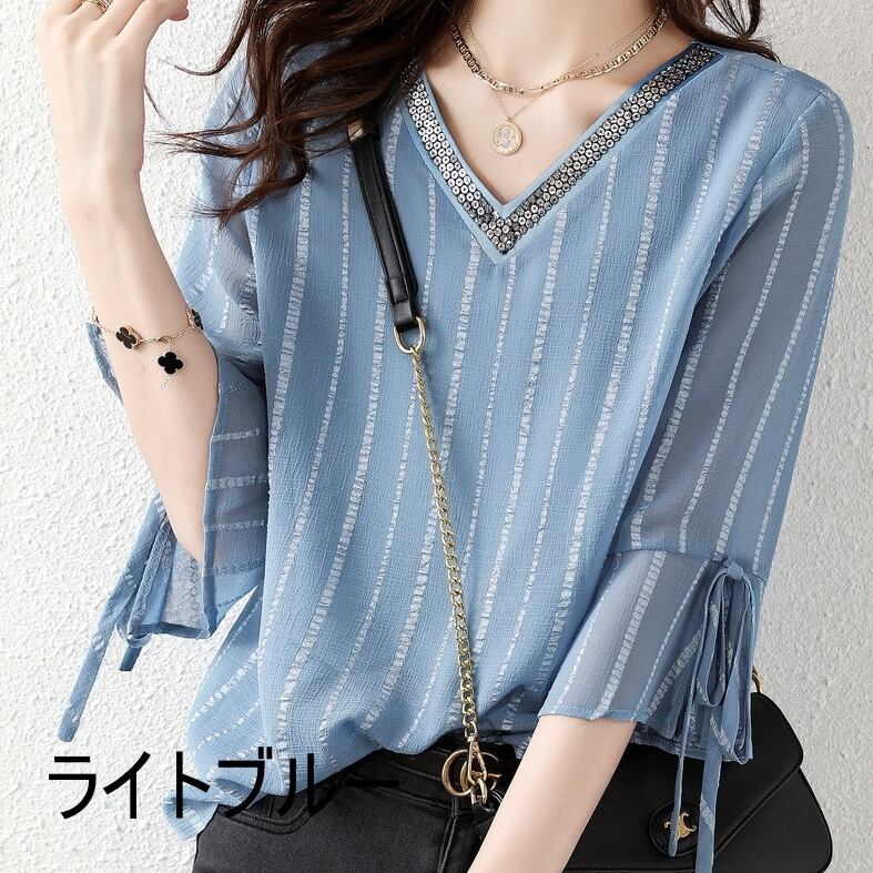 レディース トップス ニットソー セーター 袖あり 半袖 5分袖 五分袖 ボリューム袖 フレアスリーブ Vネック 襟なし 細身 切り替えデザイン シフォン 切り替えデザイン 透け感 薄手 かわいい 大人可愛い きれいめ 大人 上品 おしゃれ お洒落 大人可愛い 大人女子 S M L XL 2XL 青 ブルー ピンク ネイビー ストライプ 春 夏 秋 10代 20代 30代 40代 通勤 デート お出かけ 女子会 お泊まり 休日 着回し 普段使い ファッション 送料無料 | Rena 韓国ファッション レディースアパレル