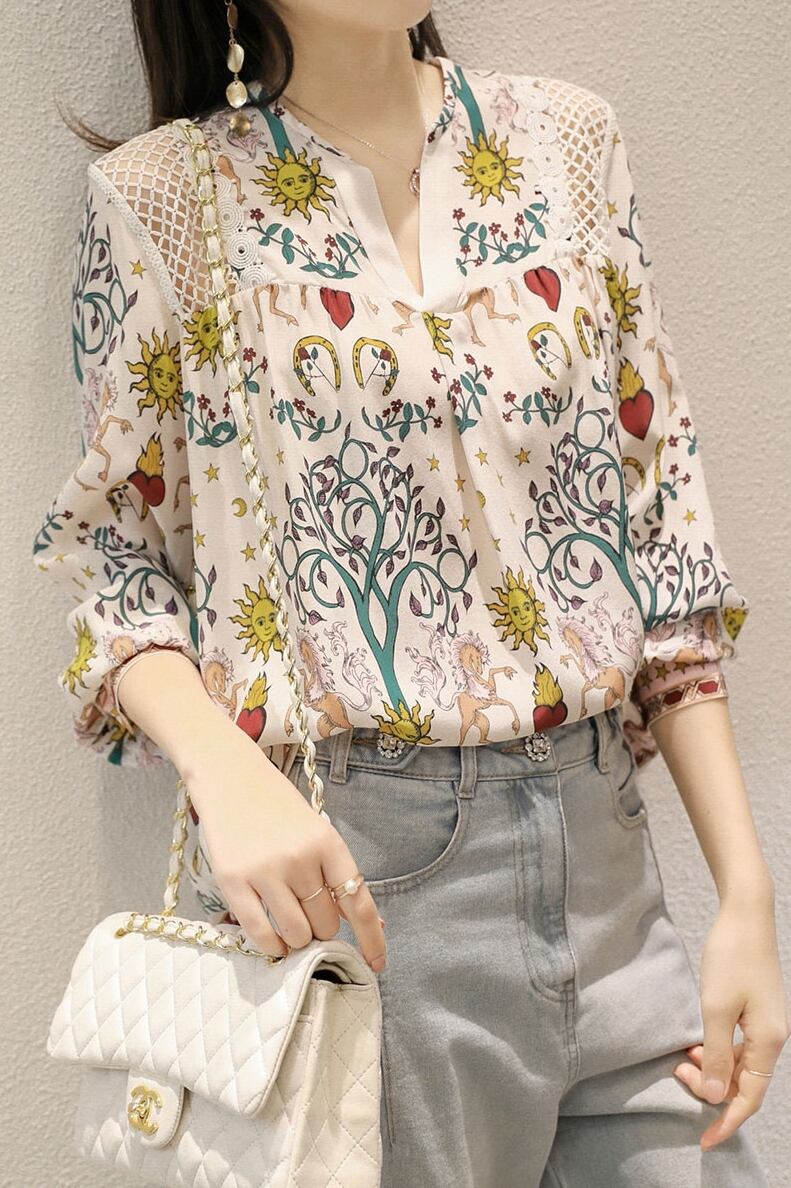 レディース トップス シャツ ブラウス カットソー 袖あり 長袖 Vネック 襟なし 透け感 薄手 大人可愛い きれいめ 大人 上品 おしゃれ お洒落 かっこいい アジアン 大人可愛い 大人女子 個性的 クール セクシー S M L XL 2XL ゆったり 柄 春 夏 秋 10代 20代 30代 40代 女性用 通勤 デート お出かけ 女子会 休日 リゾート 旅行 着回し 普段使い ファッション コーデ スタイル 定番 送料無料 トレンド 流行 インスタ映え | Rena 韓国ファッション レディースアパレル