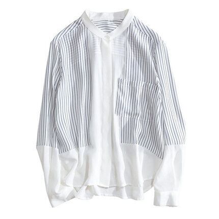 レディース トップス シャツ ブラウス カットソー 白シャツ 白トップス 袖あり 長袖 ラウンドネック クルーネック 襟付き スタンドカラー 細身 シフォン 透け感 シースルー 薄手 大人可愛い きれいめ 大人 上品 おしゃれ お洒落 大人可愛い 大人女子 クール モード系 S M L XL 白 ホワイト 柄 ストライプ 春 夏 秋 10代 20代 30代 40代 女性用 オフィス ビジネス OL 通勤 お出かけ 女子会 お泊まり 休日 運動 着回し コーデ スタイル 定番 送料無料 | Rena 韓国ファッション レディースアパレル