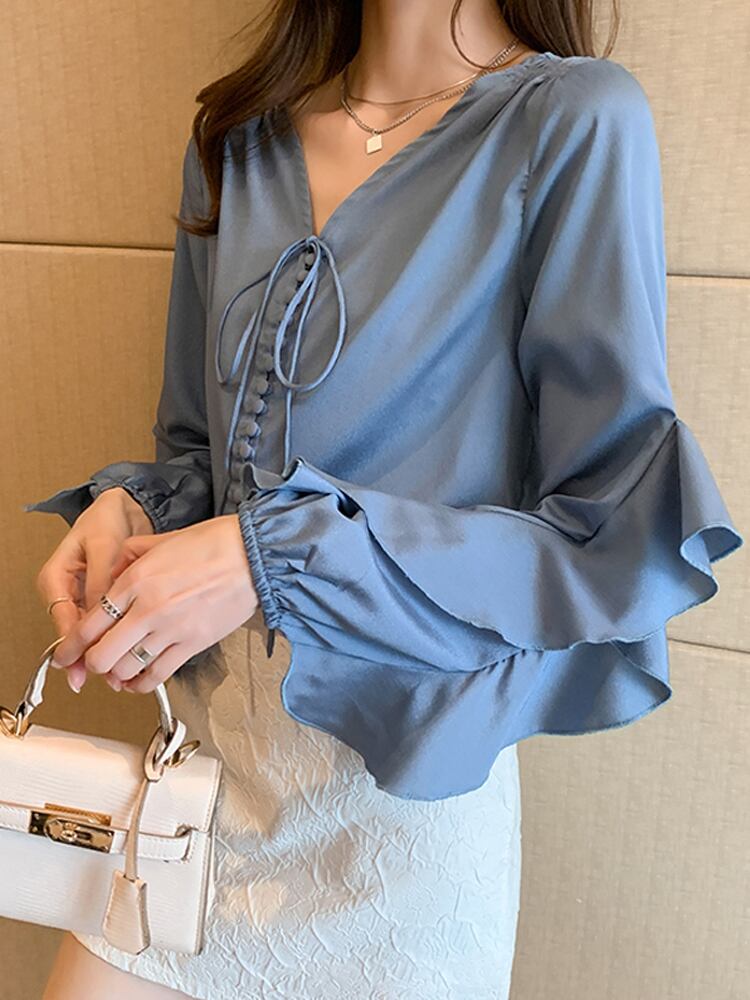 レディース トップス シャツ ブラウス 袖あり 長袖 フレアスリーブ Vネック 襟なし フレア フリル 大人可愛い きれいめ 大人 上品 おしゃれ 大人可愛い メンズライク ラブリー 個性的 セクシー エレガント 存在感 S M L XL 2XL 大きいサイズ 青 ブルー 無地 春 秋 10代 20代 30代 OL デート お出かけ 女子会 休日 パーティー イベント 旅行 韓国系 ファッション コーデ モテ 送料無料 | Rena 韓国ファッション レディースアパレル