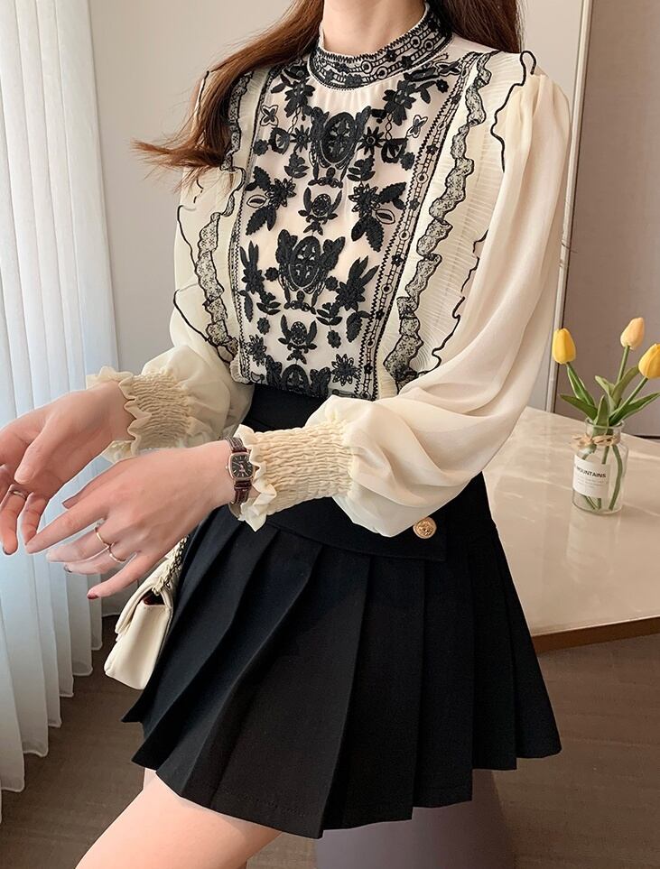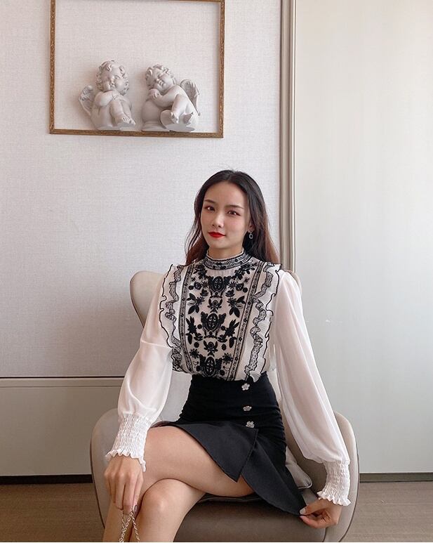 レディース トップス シャツ ブラウス 白シャツ 袖あり 長袖 ボリューム袖 スタンドカラー 刺繍 かわいい 大人可愛い きれいめ 大人 上品 おしゃれ かっこいい エスニック 大人可愛い キュート ガーリー S M L 白 ホワイト ピンク アプリコット 柄 花柄 春 秋 10代 20代 OL 学生 デート お出かけ 女子会 休日 リゾート 旅行 普段使い 韓国系 ファッション コーデ スタイル モテ 送料無料 | Rena 韓国ファッション レディースアパレル