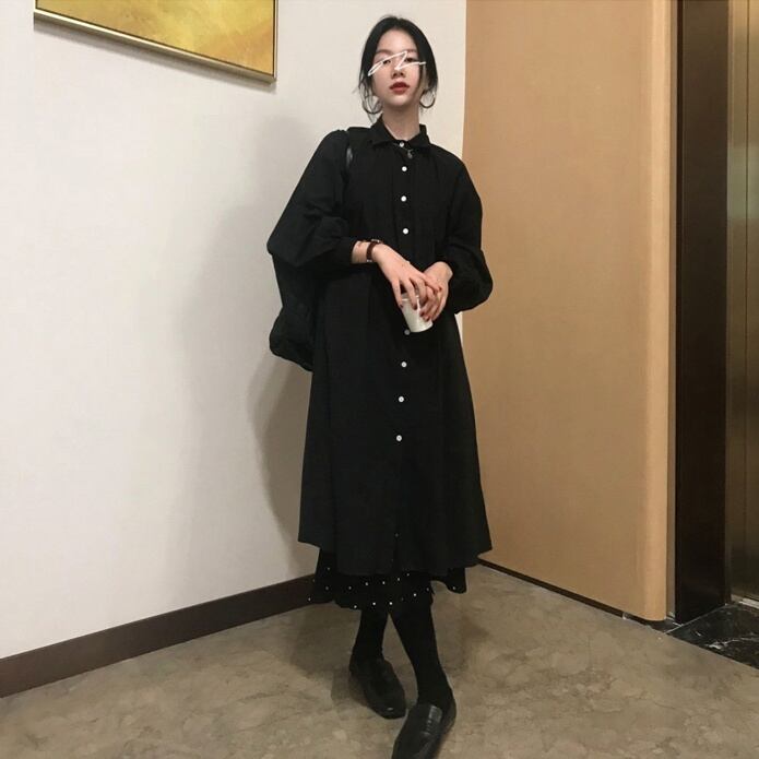 レディース ワンピース シャツワンピース 膝下 ミモレ ミモレ丈 半端丈 袖あり 長袖 襟付き かわいい きれいめ シンプル 上品 おしゃれ かっこいい レトロ 大人可愛い 個性的 モード系 フリーサイズ 黒 ブラック 無地 春 秋 冬 10代 20代 学生 通学 お出かけ 女子会 韓国 韓国系 ファッション コーデ スタイル 送料無料 | Rena 韓国ファッション レディースアパレル