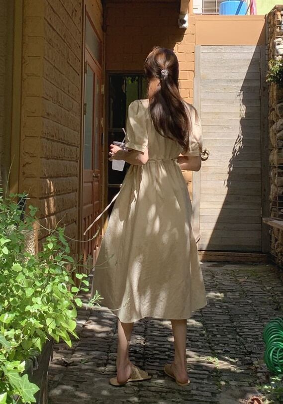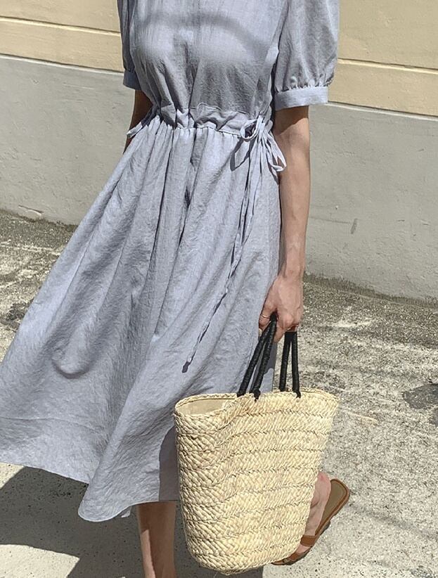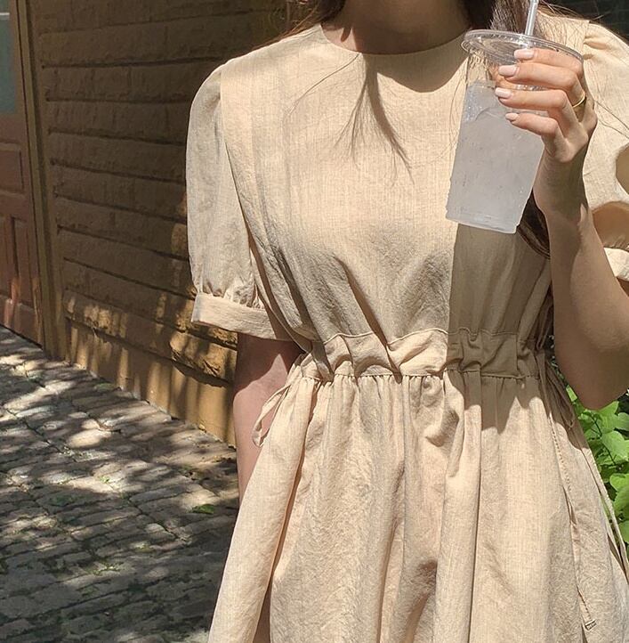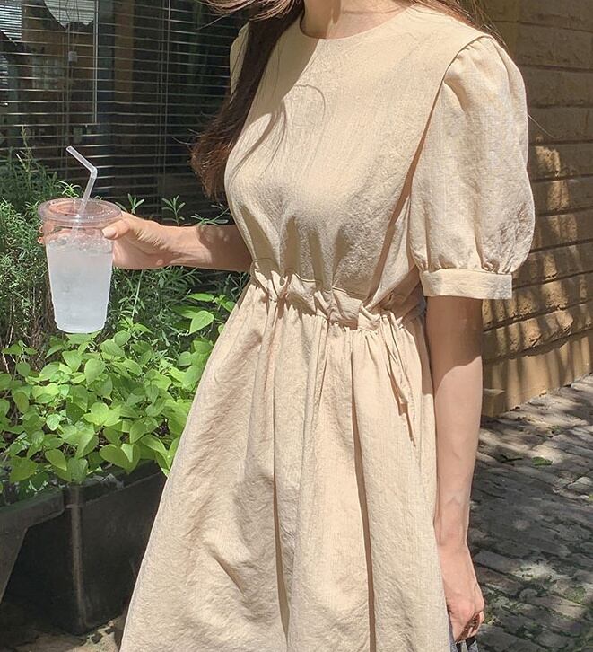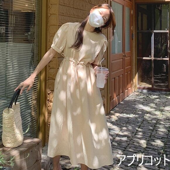 レディース ワンピース 半袖 パフスリーブ 綿 リネン かわいい 大人可愛い きれいめ シンプル 大人 上品 おしゃれ 大人女子 ガーリー S M L XL 青 ブルー アプリコット 夏 楽ちん 送料無料 | Rena 韓国ファッション レディースアパレル