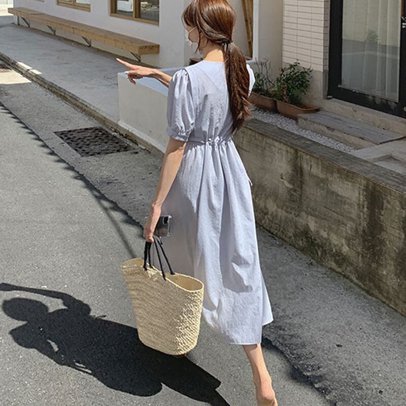レディース ワンピース 半袖 パフスリーブ 綿 リネン かわいい 大人可愛い きれいめ シンプル 大人 上品 おしゃれ 大人女子 ガーリー S M L XL 青 ブルー アプリコット 夏 楽ちん 送料無料