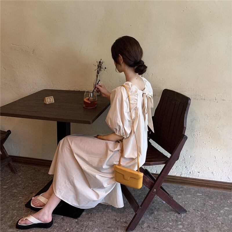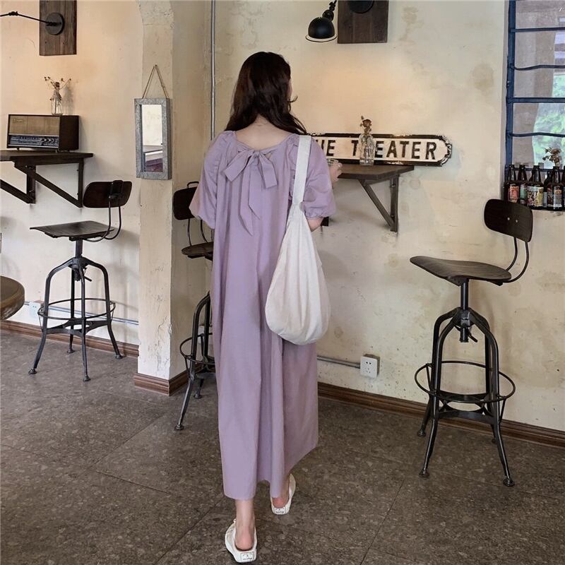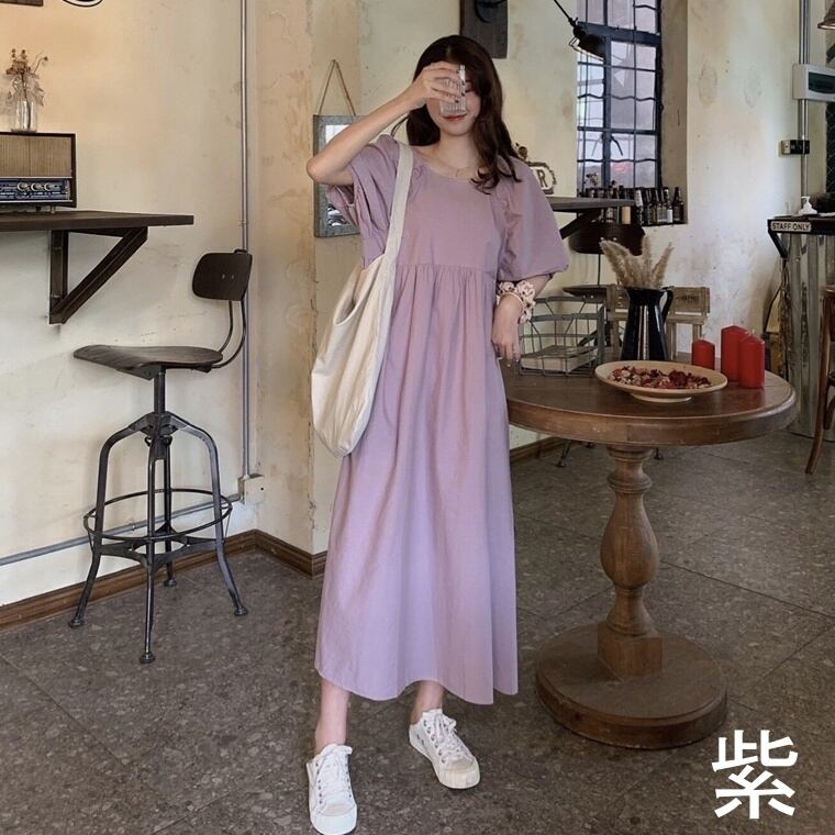 レディース ワンピース ロング ロング丈 パフスリーブ リボン かわいい 大人可愛い シンプル 上品 おしゃれ 大人可愛い ガーリー 白 ホワイト 紫 パープル デート お出かけ 女子会 休日 普段使い 楽ちん モテ 送料無料 | Rena 韓国ファッション レディースアパレル