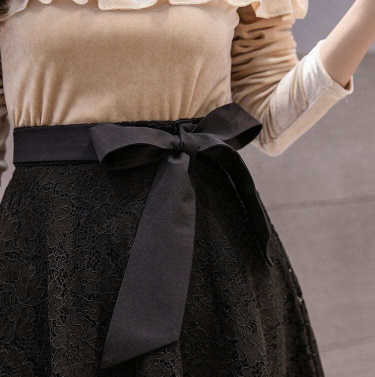 レディース スカート 膝丈 ひざ丈 Aライン レース ウエストマーク ウエストリボン かわいい きれいめ シンプル 上品 おしゃれ レトロ 大人可愛い ラブリー キュート エレガント S M L XL 2XL 白 ホワイト 黒 ブラック 無地 春 秋 10代 20代 OL 学生 デート お出かけ 女子会 パーティー イベント ファッション コーデ スタイル 送料無料 | Rena 韓国ファッション レディースアパレル