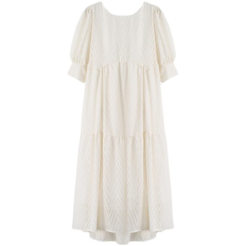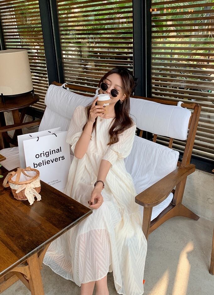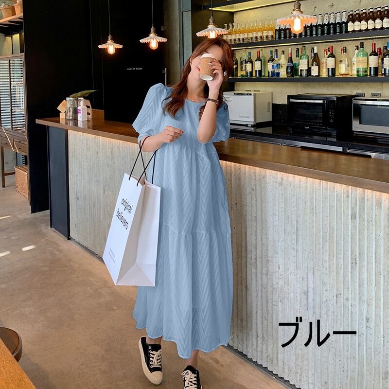 レディース ワンピース ロング ロング丈 袖あり 半袖 5分袖 五分袖 ボリューム袖 シフォン かわいい きれいめ シンプル カジュアル 大人 上品 おしゃれ 大人可愛い 大人女子 ラフ ガーリー とろみ感 M L XL 2XL 3XL 4XL 白 ホワイト 青 ブルー 水色 無地 春 夏 10代 20代 30代 ママ OL 学生 通学 デート お出かけ 女子会 休日 リゾート 旅行 海 ファッション コーデ スタイル 楽ちん 送料無料 | Rena 韓国ファッション レディースアパレル
