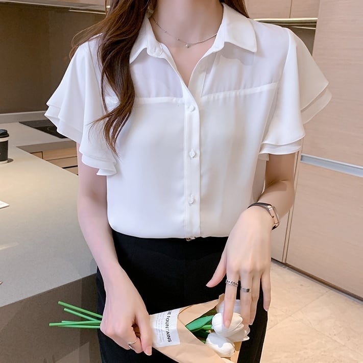 レディース トップス シャツ ブラウス カットソー 白シャツ 白トップス 袖あり 半袖 フレアスリーブ 襟付き フリル 前開き 大人可愛い きれいめ シンプル 大人 上品 おしゃれ 大人女子 ガーリー フォーマル S M L XL 2XL 3XL 4XL 白 ホワイト 水色 無地 春 夏 秋 入学式 入園式 卒業式 卒園式 10代 20代 30代 女性用 ママ オフィス OL 通勤 学生 通学 デート お出かけ 女子会 休日 イベント 着回し モテ 定番 送料無料 流行 インスタ映え