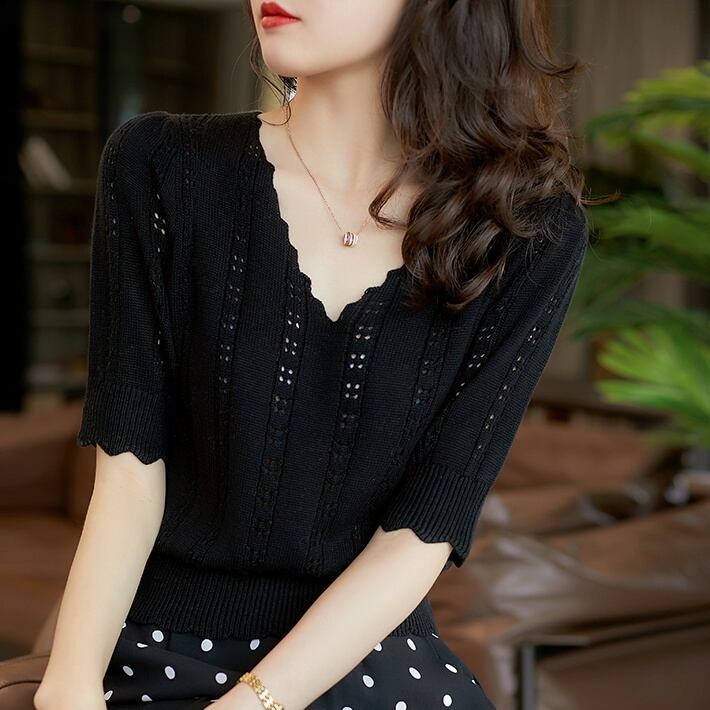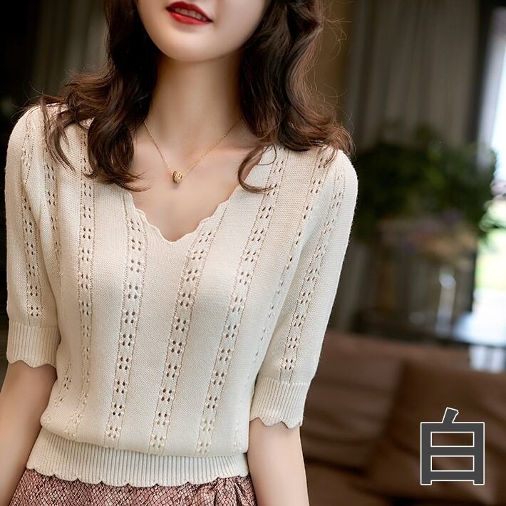 レディース トップス シャツ ニットソー 袖あり 5分袖 五分袖 Vネック タイト レース 透け感 サマーニット かわいい 大人可愛い きれいめ シンプル カジュアル 大人 おしゃれ お洒落 大人女子 こなれ感 ラフ キュート ガーリー ルーズ 個性的 抜け感 S M L XL 白 ホワイト 黒 ブラック 大人カラー モノトーン 柄 春 夏 20代 30代 40代 女性用 ママ オフィス OL 通勤 学生 デート お出かけ 女子会 休日 イベント 着回し 普段使い 韓国 オルチャン モテ 送料無料 | Rena 韓国ファッション レディースアパレル