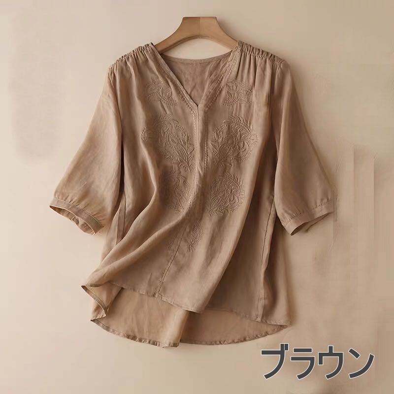 レディース トップス ブラウス カットソー 袖あり 5分袖 Vネック フレア ワイド 刺繍 透け感 大人可愛い きれいめ シンプル カジュアル 大人 上品 おしゃれ レトロ エスニック 大人女子 ラフ ルーズ 個性的 M L XL 2XL 3XL 4XL くすみカラー 大人カラー 春カラー カラバリ 柄 ボタニカル 春 夏 30代 40代 50代 女性用 ママ OL お出かけ 女子会 休日 アウトドア 旅行 海 着回し 普段使い 韓国 ファッション 楽ちん 体系カバー 送料無料 ゆったり | Rena 韓国ファッション レディースアパレル