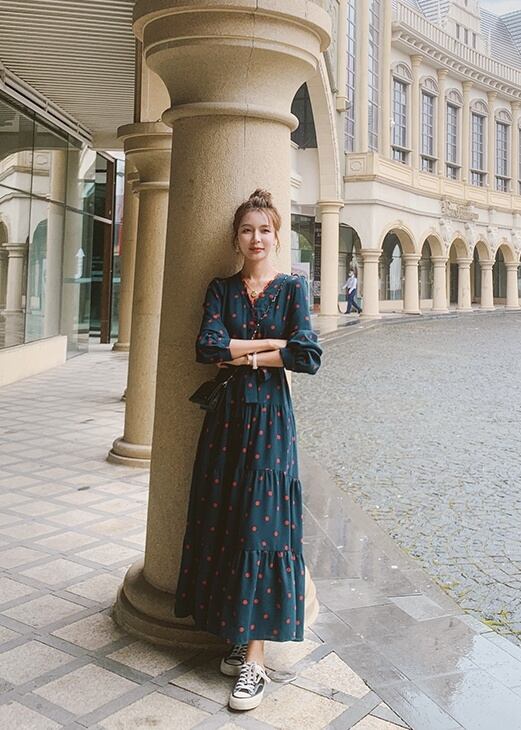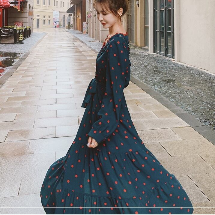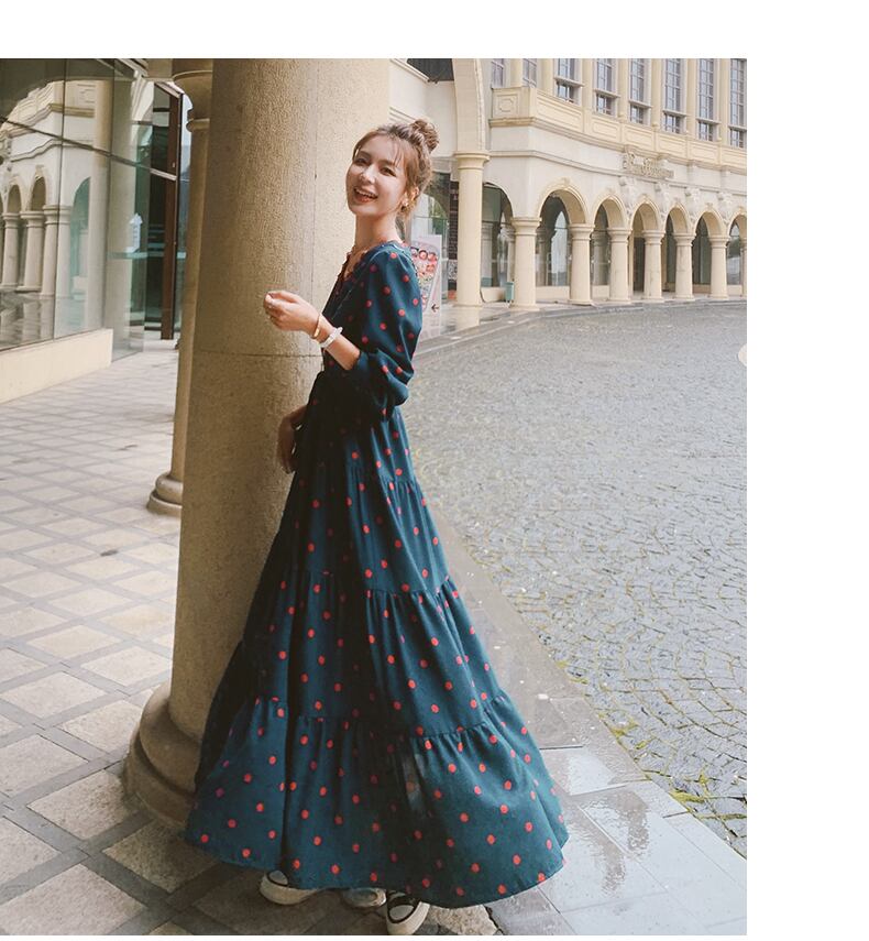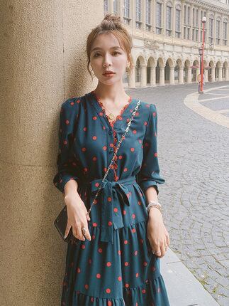 レディース ワンピース ロング ロング丈 マキシ マキシ丈 袖あり 長袖 Vネック 襟なし Aライン リボン ウエストマーク ウエストリボン かわいい 大人可愛い 大人 おしゃれ お洒落 大人可愛い 大人女子 キュート ガーリー S M L XL ドット柄 水玉 10代 20代 30代 デート お出かけ 女子会 お泊まり 休日 着回し 普段使い ファッション コーデ スタイル 送料無料 | Rena 韓国ファッション レディースアパレル