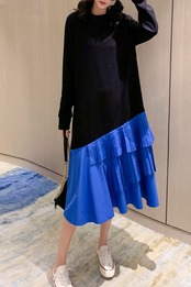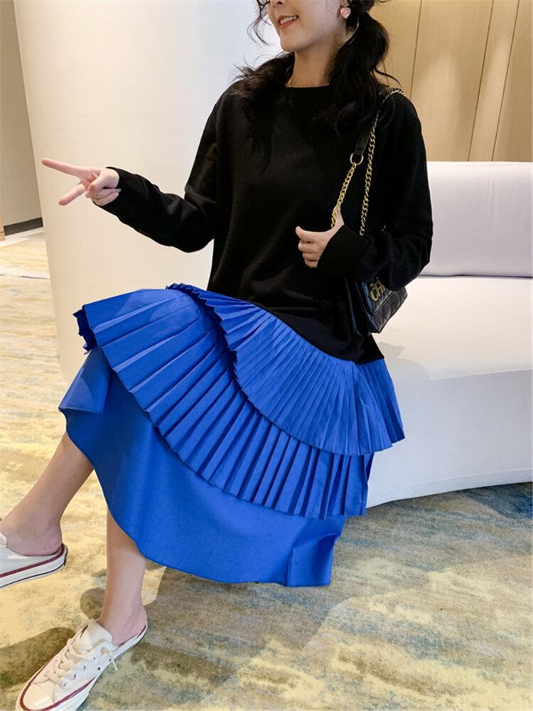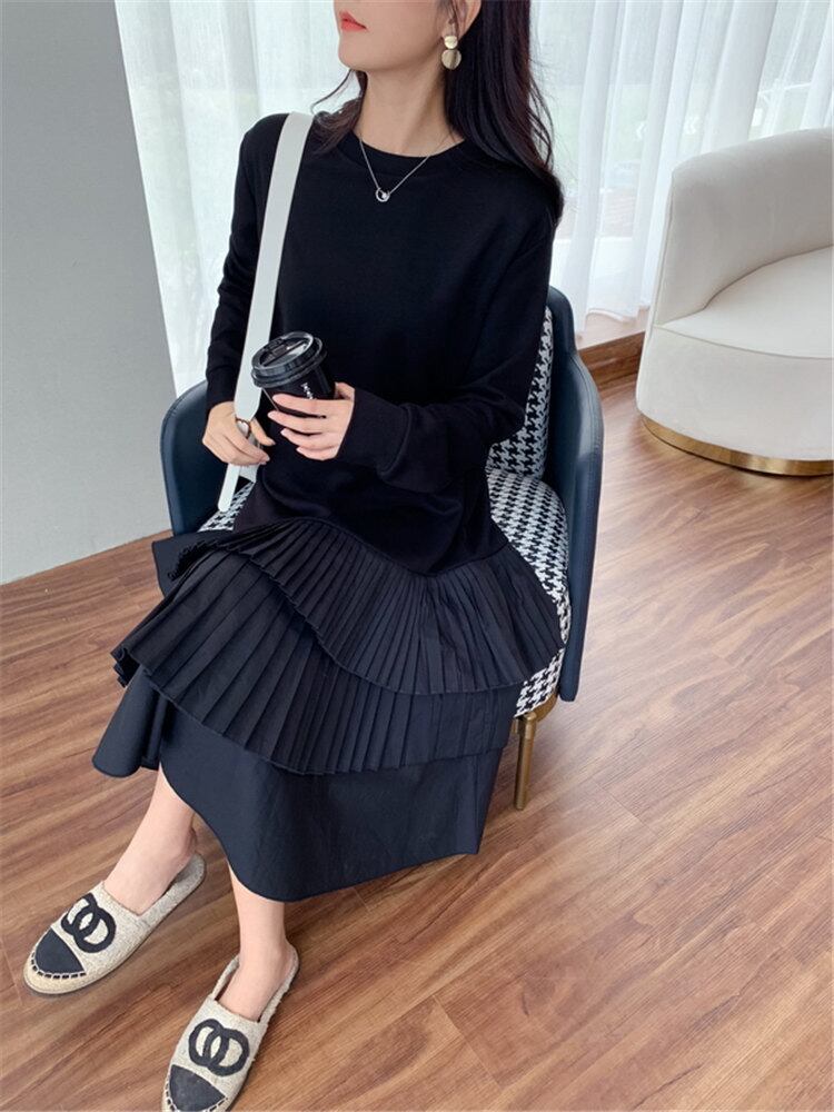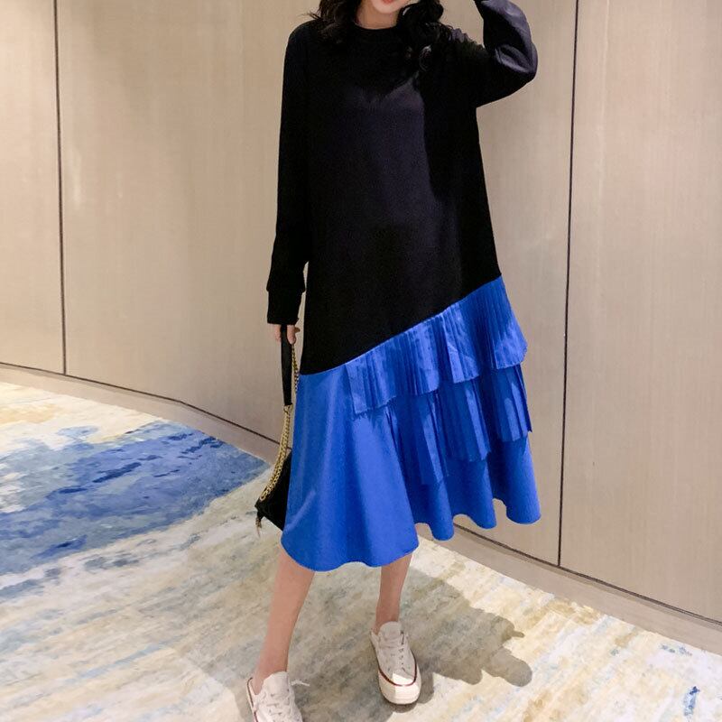 レディース ワンピース 膝下 ミモレ ミモレ丈 袖あり 長袖 Uネック ラウンドネック クルーネック 切り替えデザイン プリーツ かわいい 大人可愛い 大人 おしゃれ お洒落 大人女子 こなれ感 個性的 L XL 2XL 黒 ブラック 青 ブルー 無地 春 夏 秋 10代 20代 30代 デート お出かけ 女子会 お泊まり 休日 旅行 着回し 普段使い 韓国 韓国系 ファッション コーデ スタイル 楽ちん 送料無料 | Rena 韓国ファッション レディースアパレル