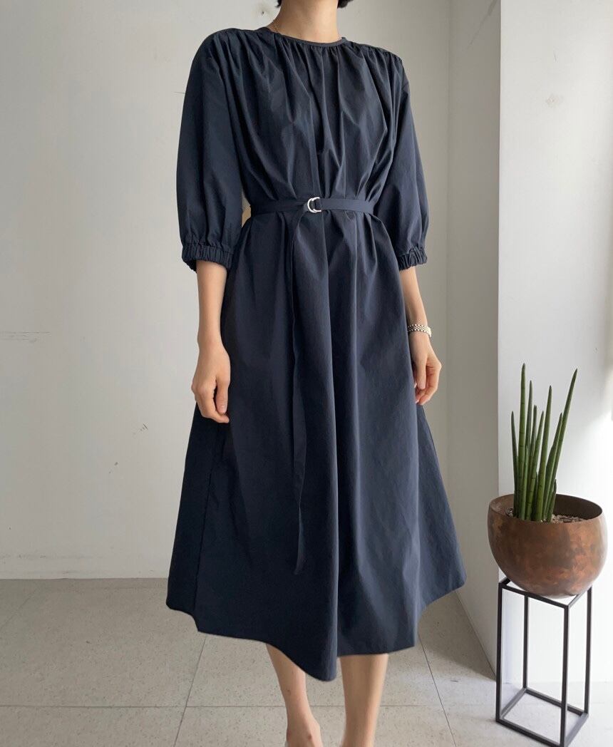 レディース ワンピース シャツワンピース ミモレ ミモレ丈 袖あり 5分袖 五分袖 7分袖 七分袖 Uネック ラウンドネック クルーネック 襟なし Aライン リボン ウエストリボン 大人可愛い きれいめ 大人 上品 おしゃれ お洒落 大人可愛い 大人女子 フリーサイズ ネイビー 無地 春 夏 秋 10代 20代 30代 40代 50代 OL 通勤 デート お出かけ 女子会 お泊まり 休日 着回し 普段使い ファッション コーデ スタイル 送料無料 | Rena 韓国ファッション レディースアパレル