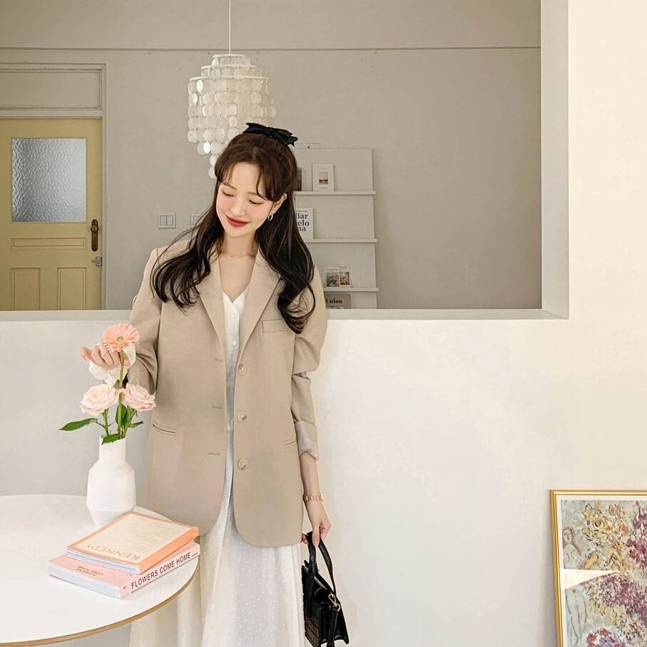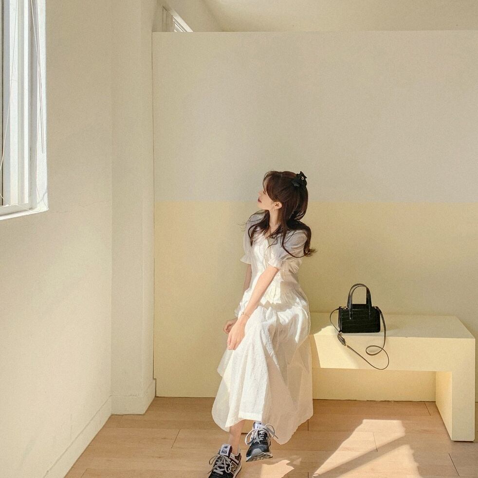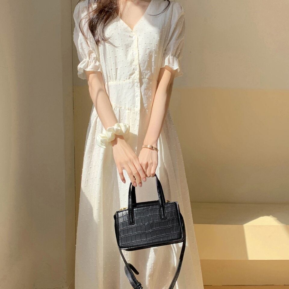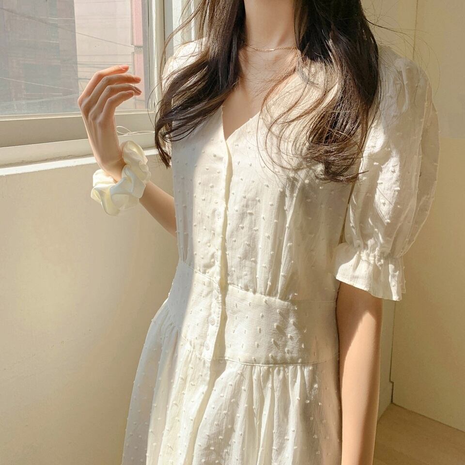 レディース ワンピース ミモレ ミモレ丈 ロング ロング丈 袖あり 半袖 パフスリーブ 襟なし 切り替えデザイン 大人 おしゃれ お洒落 大人可愛い 大人女子 こなれ感 メンズライク ラブリー キュート ガーリー S M L ゆったり 白 ホワイト ドット柄 水玉 春 夏 20代 30代 40代 デート お出かけ 女子会 お泊まり 休日 パーティー リゾート 旅行 海 韓国 韓国系 ファッション モテ 送料無料 | Rena 韓国ファッション レディースアパレル