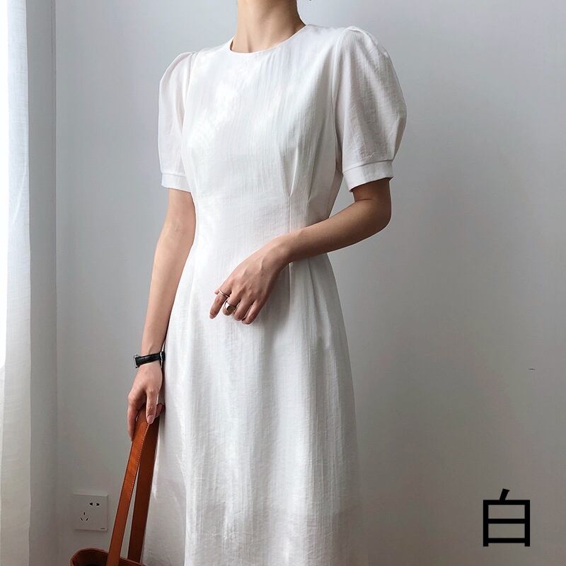 レディース ワンピース ミモレ ミモレ丈 袖あり 半袖 パフスリーブ 襟なし シンプル 大人 上品 おしゃれ お洒落 大人可愛い 大人女子 メンズライク M L 白 ホワイト 黒 ブラック ブルー 水色 無地 春 夏 秋 謝恩会 二次会 20代 30代 40代 OL 通勤 デート お出かけ 韓国 韓国系 ファッション モテ 送料無料 | Rena 韓国ファッション レディースアパレル