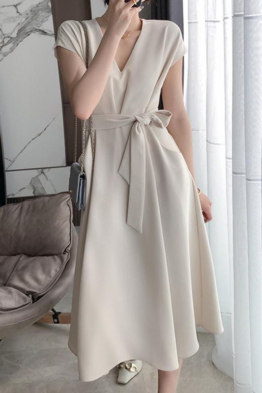 レディース ワンピース ニット ミモレ ミモレ丈 袖あり 半袖 Vネック フレア Aライン リボン かわいい 大人可愛い シンプル 大人 おしゃれ お洒落 こなれ感 ラフ メンズライク ラブリー キュート ガーリー M L XL 2XL 3XL 4XL 黒 ブラック オフホワイト ベージュ 無地 春 夏 秋 20代 30代 オフィス ビジネス OL 通勤 学生 通学 デート お出かけ 女子会 パーティー イベント リゾート 韓国 韓国系 ファッション 送料無料 | Rena 韓国ファッション レディースアパレル