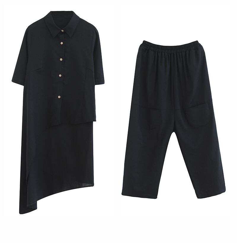 着丈がアシンメトリーなシャツと、カジュアルなバギーパンツがセットになっています。