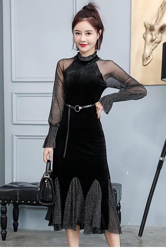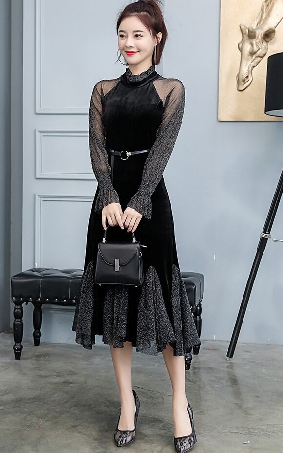 レディース ワンピース ミモレ ミモレ丈 ロング ロング丈 袖あり 長袖 クルーネック 襟付き スタンドカラー フレア 細身 Aライン フリル ベルト 透け感 シースルー 大人可愛い 大人 上品 おしゃれ お洒落 大人可愛い 大人女子 セクシー エレガント S M L XL 黒 ブラック 赤 レッド 無地 春 夏 秋 クリスマス 10代 20代 30代 デート パーティー イベント ファッション コーデ スタイル モテ 美脚 脚長 送料無料 | Rena 韓国ファッション レディースアパレル
